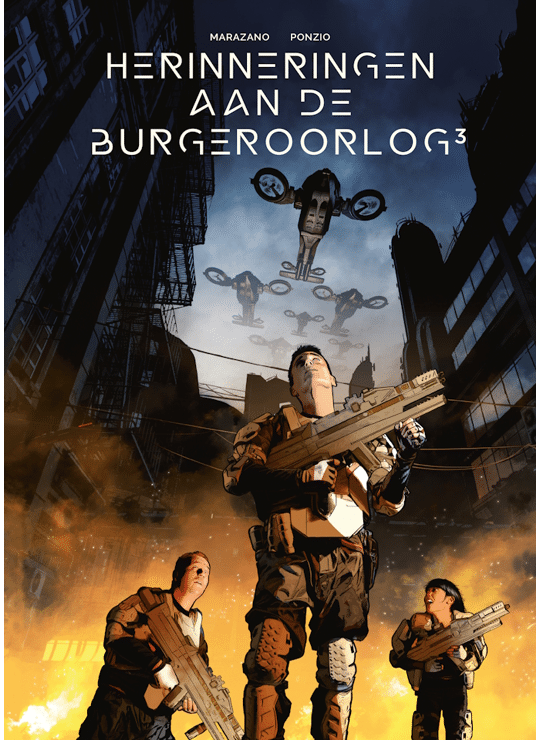 Indrukwekkend stripboek over een toekomstige burgeroorlog, waarin herinneringen, trauma en morele keuzes centraal staan in een verwoeste stad.